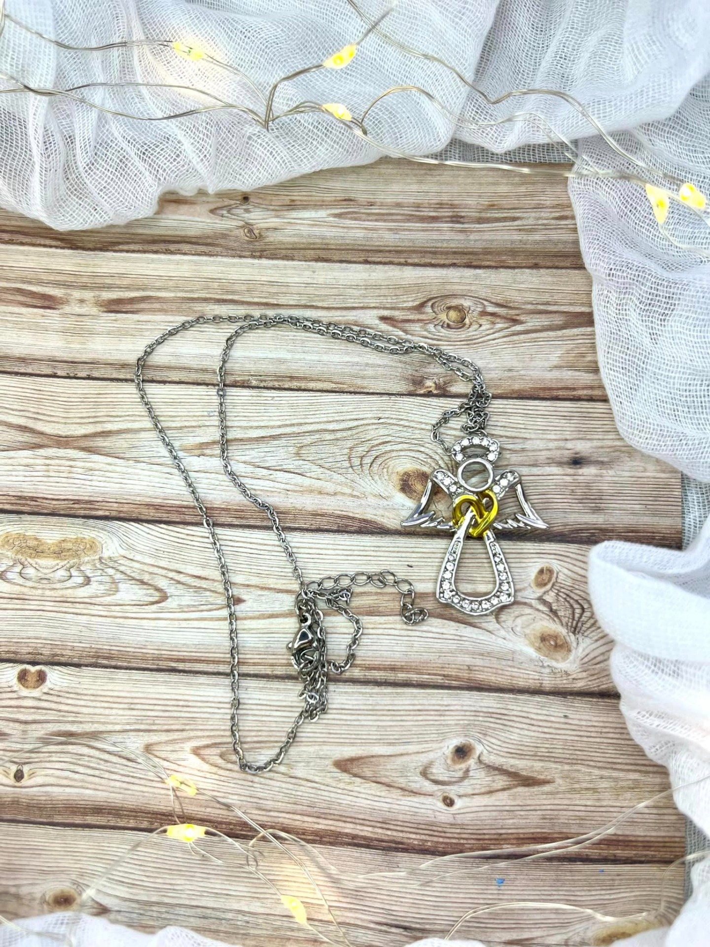 řetízku je přívěsek s Andělem , propojen se zlatým srdcem a posázen třpytivými