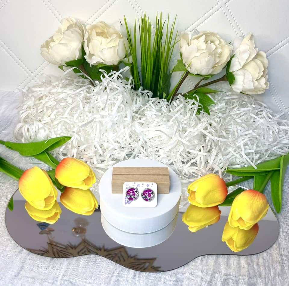 náušnice ve tvaru kruhu v bílé barvě s tmavě růžovými květinami