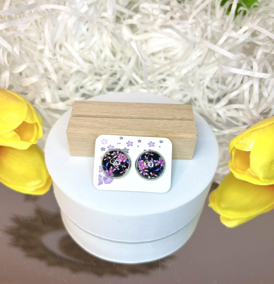 náušnice ve tvaru kruhu v černé barvě s květinami