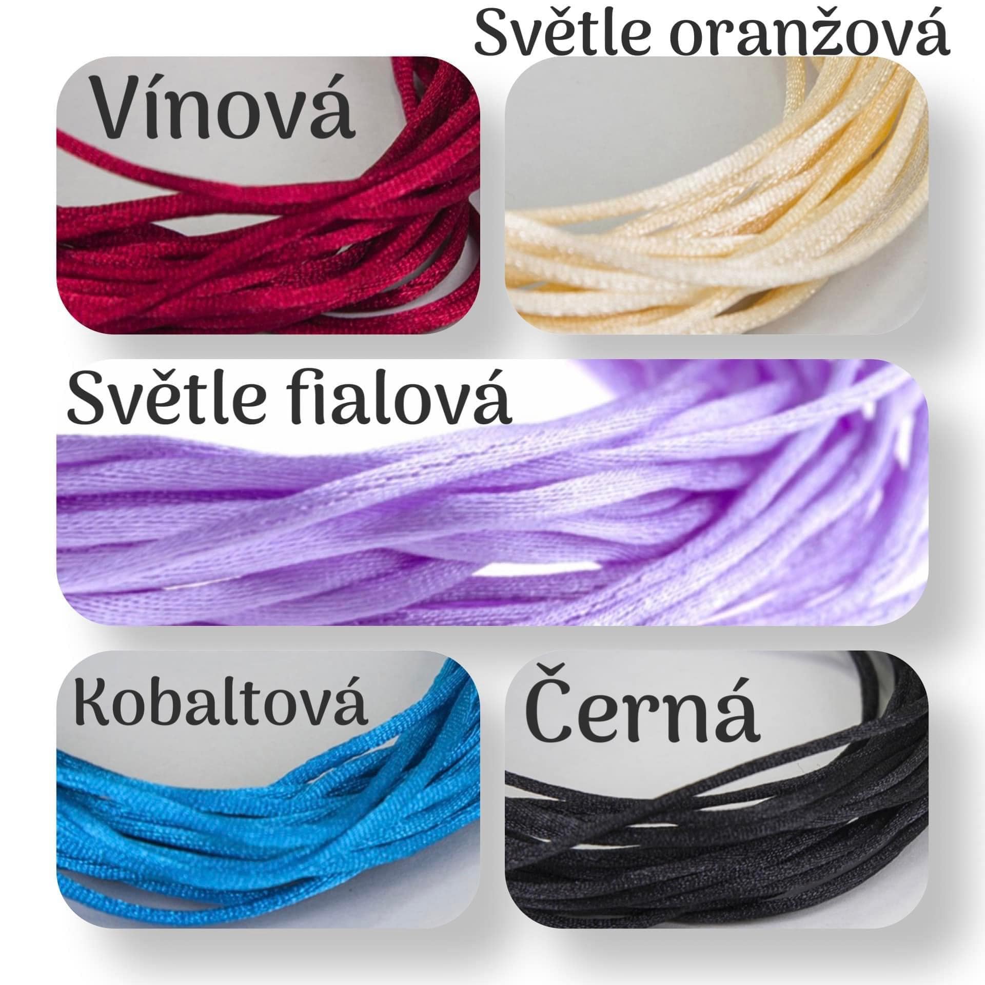 - Náramek je vyrobený ze saténové šňůrky, který má posuvné uzlíky. Díky nim si můžete nastavit velikost podle své potřeby