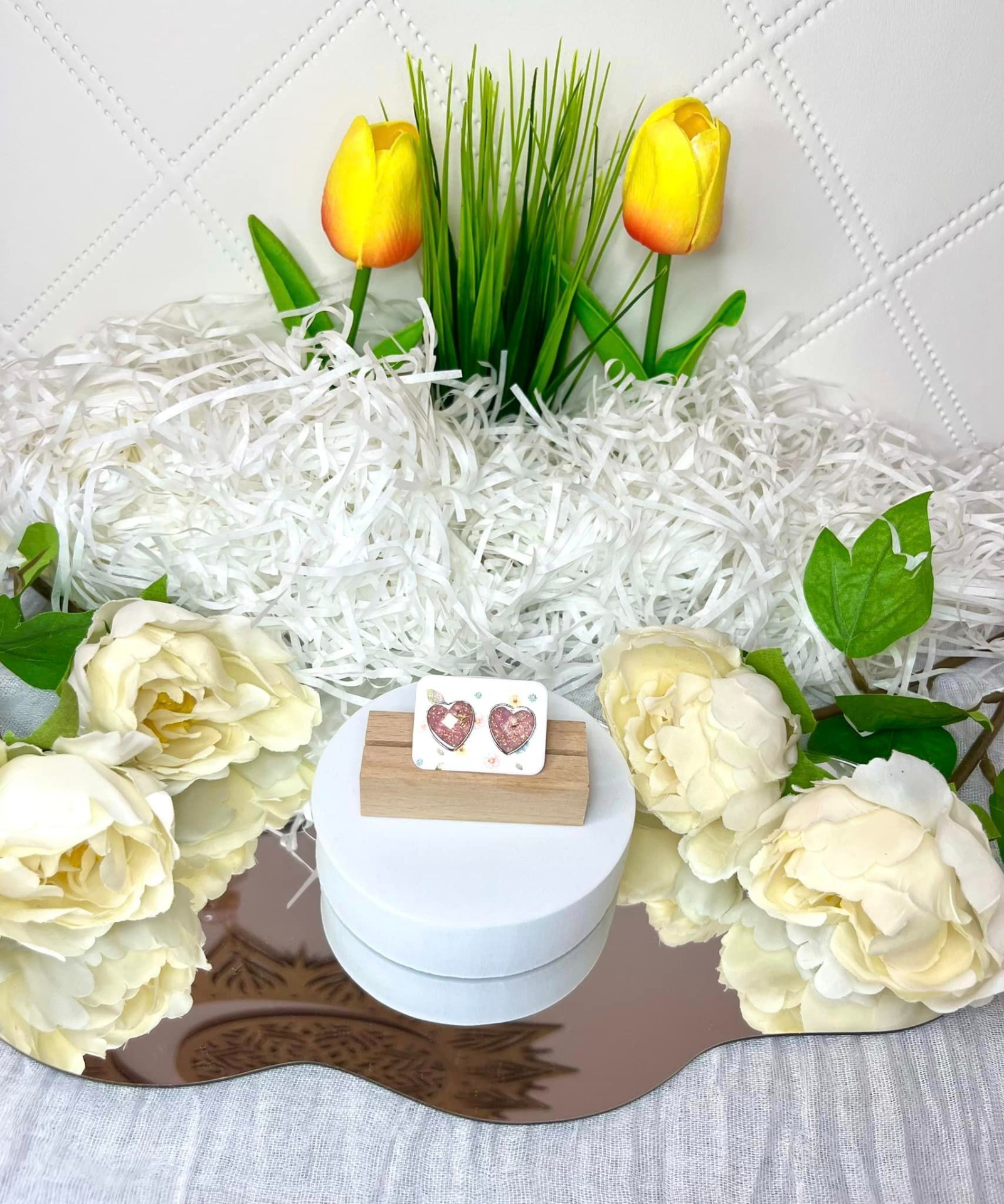 náušnice ve tvaru srdce ve světle růžově barvě se zlatými třpytkami